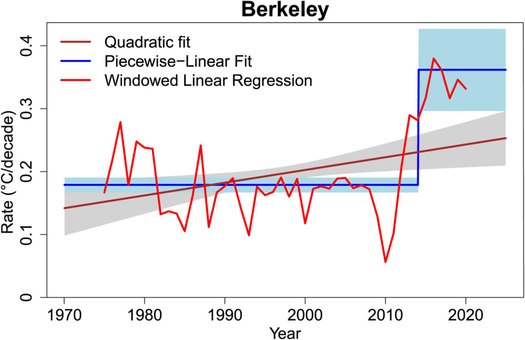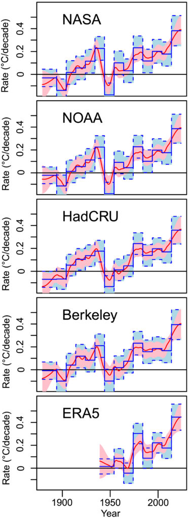 Desde 2015, la tasa de calentamiento se sitúa en torno a 0,35 °C por década, prácticamente el doble de la tendencia observada entre 1970 y 2015, que era inferior a 0,2 °C por década.