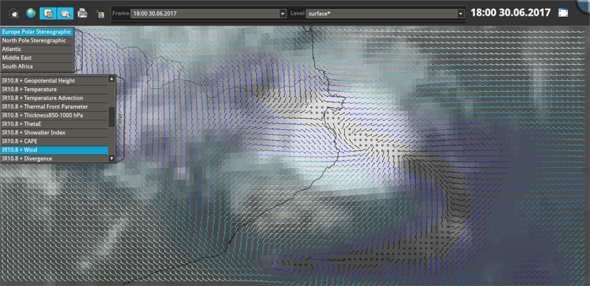 Imagen infrarroja y campo de vientos para el nivel de la superficie, 30 de junio de 2017, 18 UTC. Crédito: eumetrain.