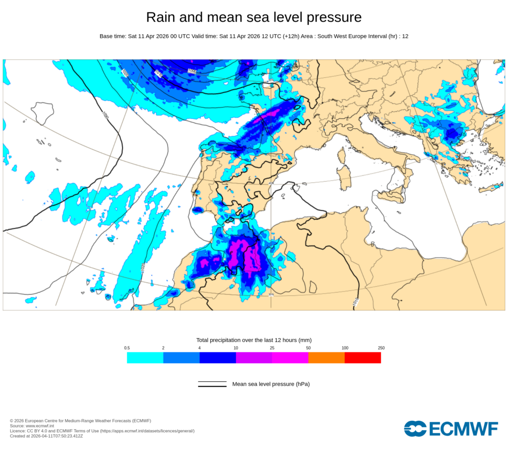 Con este panorama, se darán precipitaciones en amplias zonas del territorio, asociadas al paso del frente en el tercio norte, y principalmente en forma de chubascos vespertinos acompañados de tormenta en el resto.