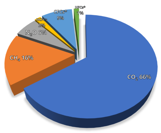 El metano (CH4) es el causante de cerca del 16 % del efecto de calentamiento del clima provocado por los gases de efecto invernadero de larga duración y tiene una vida media de unos nueve años.