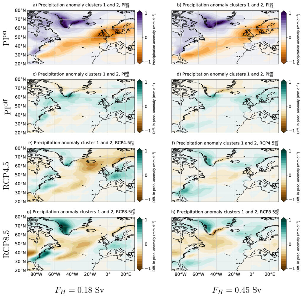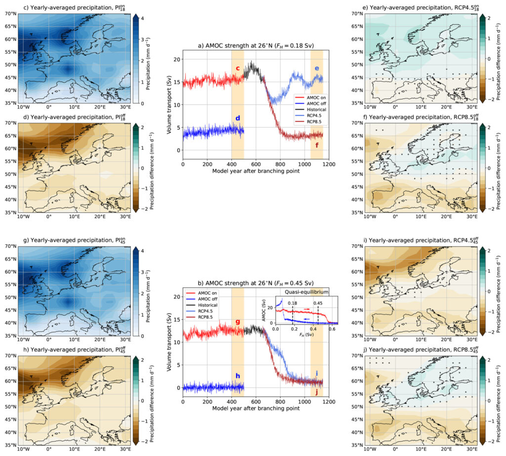 Los modelos climáticos de las últimas investigaciones analizan cómo variaría la precipitación europea en dos escenarios: uno en el que la AMOC continúa debilitándose sin romperse y otro en el que se produce su colapso total. La diferencia entre ambos es enorme.