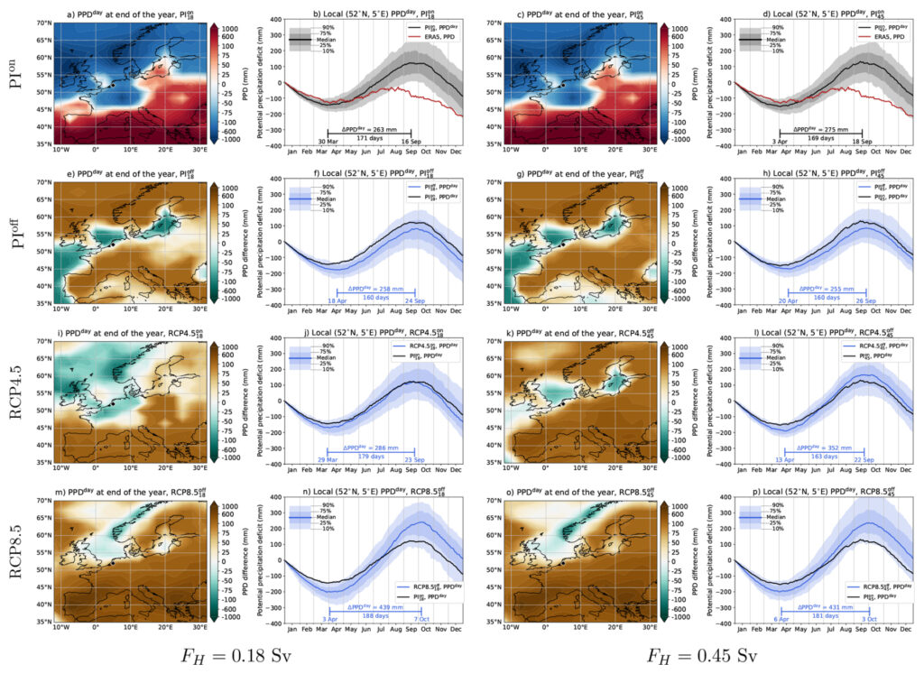 El estudio anticipa un contraste significativo entre el norte y el sur de Europa. Por ejemplo, en Suecia, la temporada seca aumenta un 54 % con la AMOC y un 72 % sin ella. España, que ya sufre una sequía extrema, vería aumentar su temporada seca un 40 % con la AMOC y un 60 % sin ella.