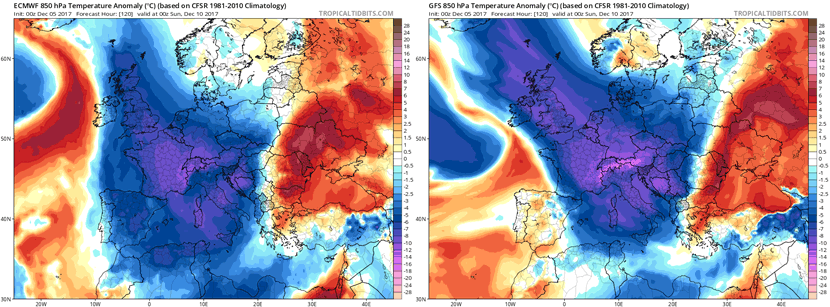 Comparativa de anomalía de temperatura al nivel de 850 hPa entre los modelos europeo IFS/ECMWF a la izquierda, y el americano GFS/NCEP a la derecha. Nuevo desalojo de masas de aire polar.