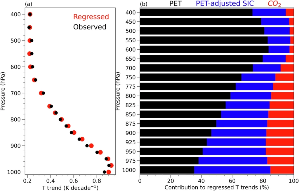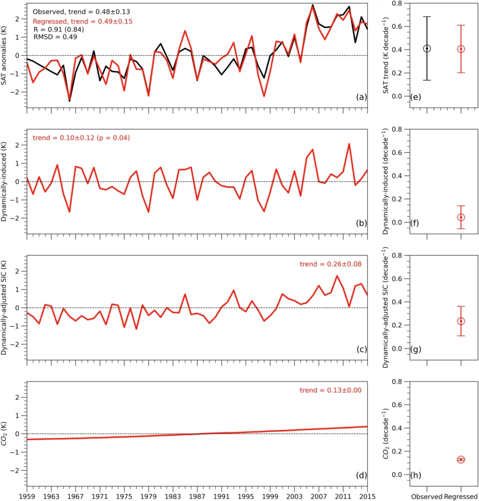 Descubrieron que aproximadamente un 53 % del calentamiento invernal del Ártico se debe a la pérdida de hielo ajustada dinámicamente, alrededor de un 20 % a la circulación atmosférica, y el resto a efectos directos del CO₂.