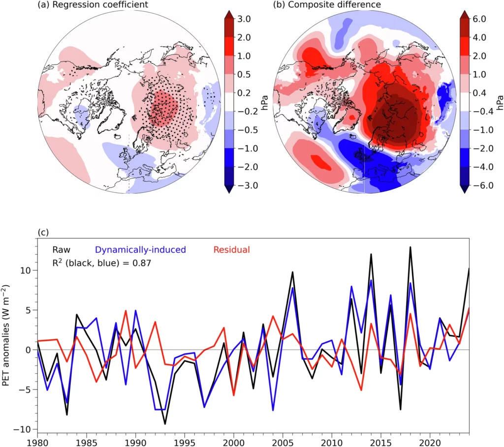 Los autores identifican un “componente dinámico inducido” asociado a patrones de presión capaces de movilizar calor y humedad hacia el Ártico, con impacto especialmente marcado en niveles medios de la atmósfera.