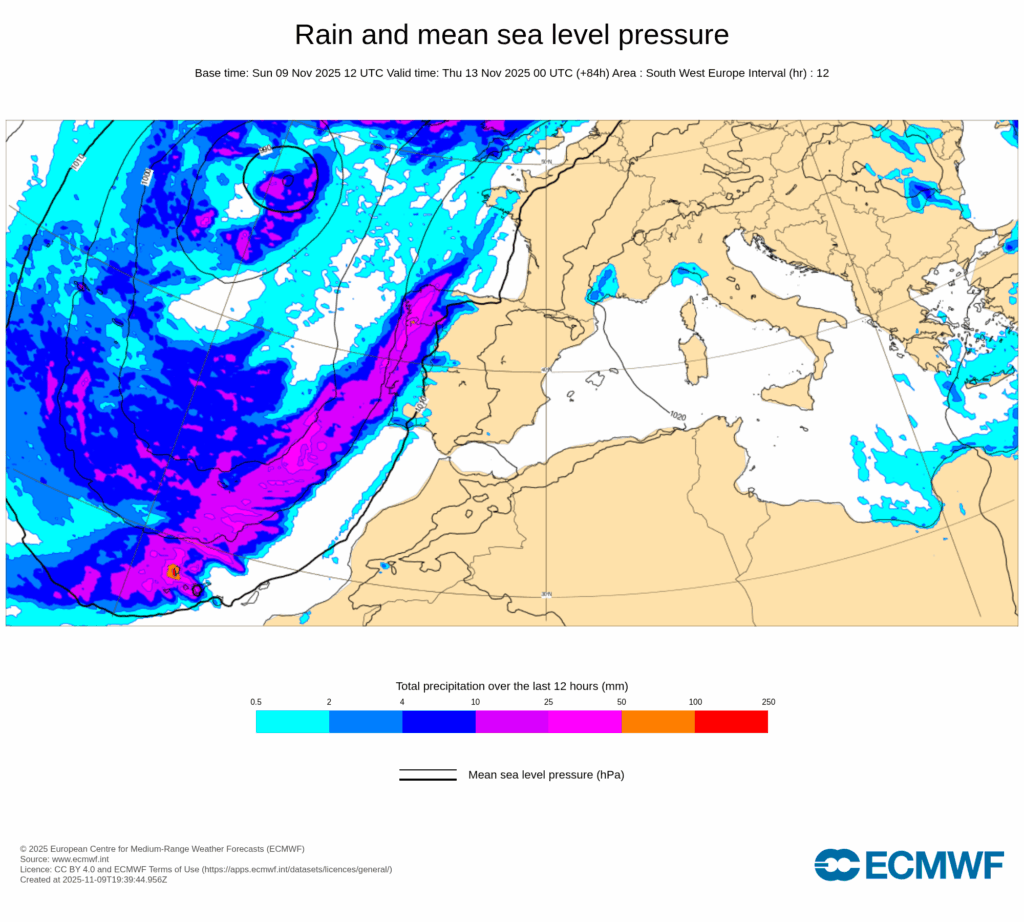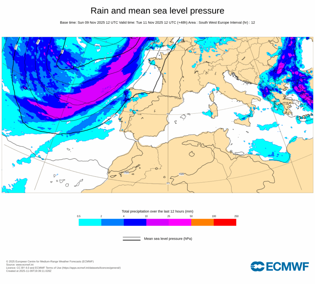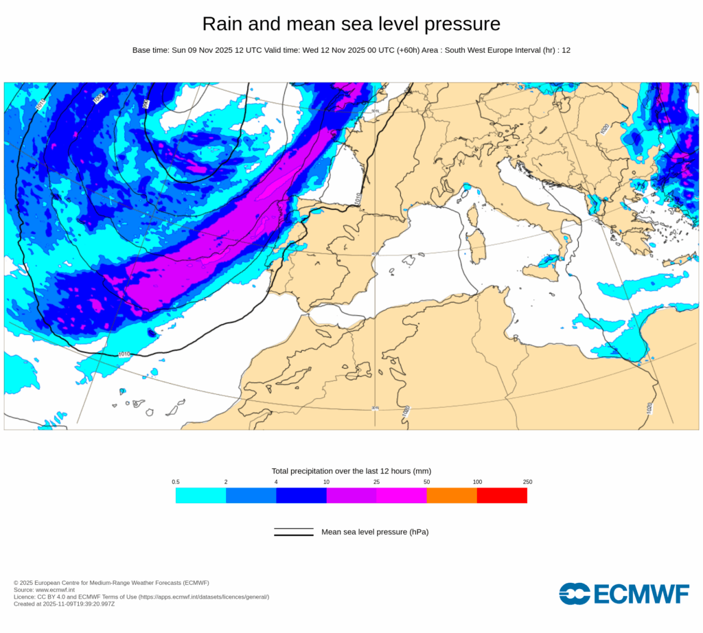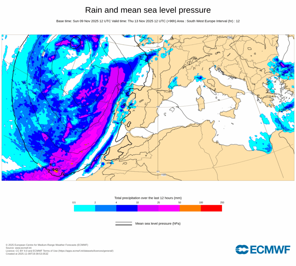 Las precipitaciones afectarán al oeste de Asturias y de Castilla y León, entorno del sistema Central, noroeste de Extremadura y especialmente a Galicia, donde en su mitad occidental es probable que sean persistentes y ocasionalmente fuertes con tormentas que podrían dar lugar a acumulaciones significativas en el oeste de A Coruña. Asimismo, podrían acabar afectando a otras zonas del Cantábrico, meseta norte y oeste de la meseta sur en función de la evolución del frente.