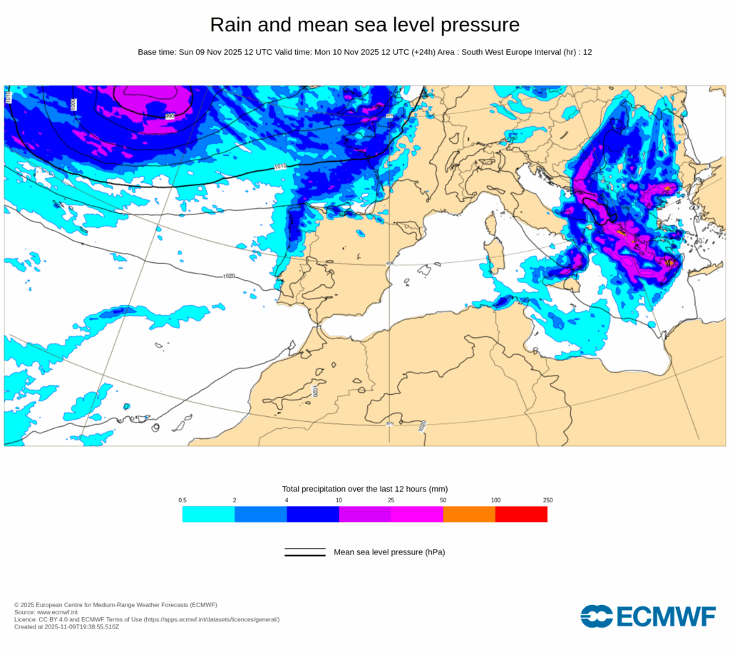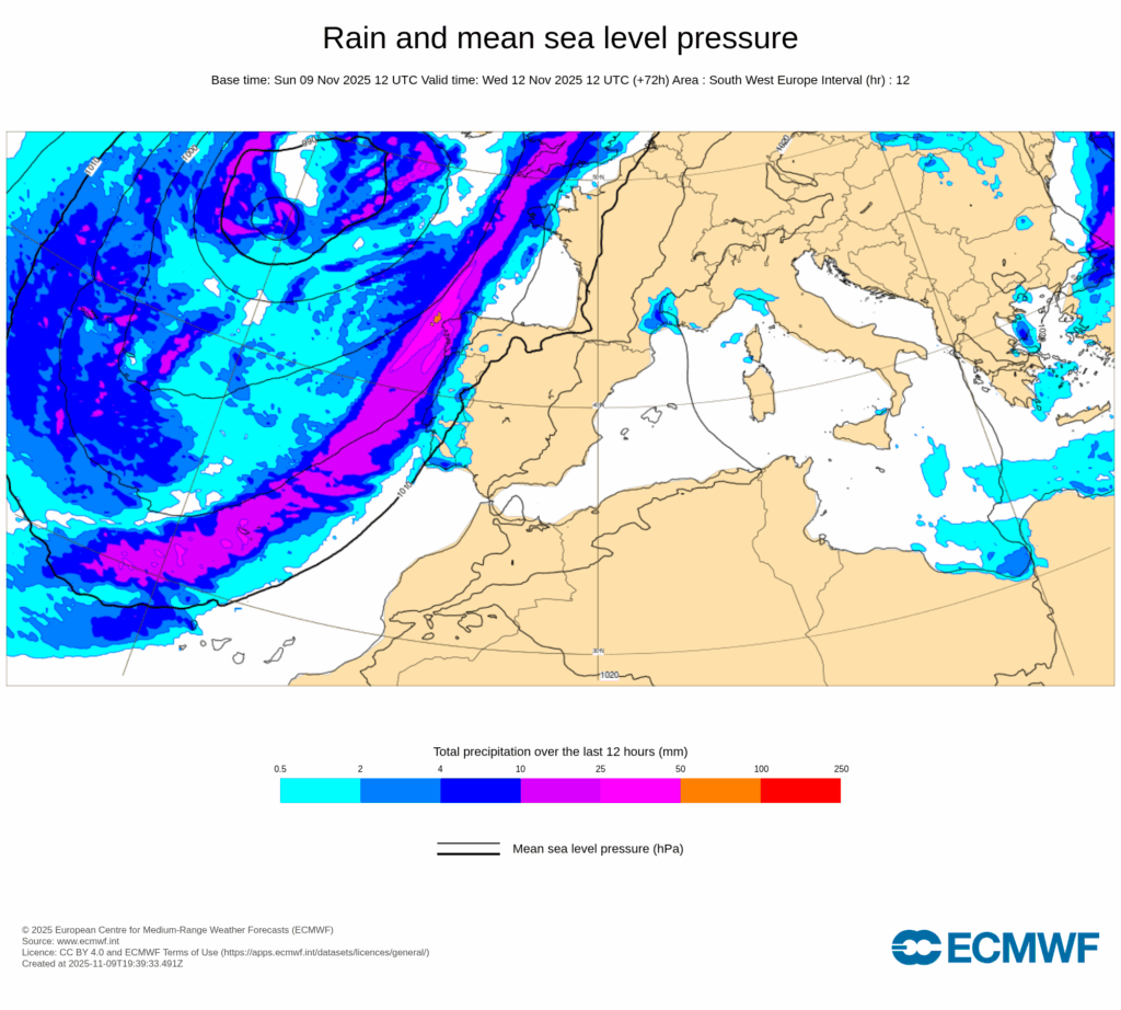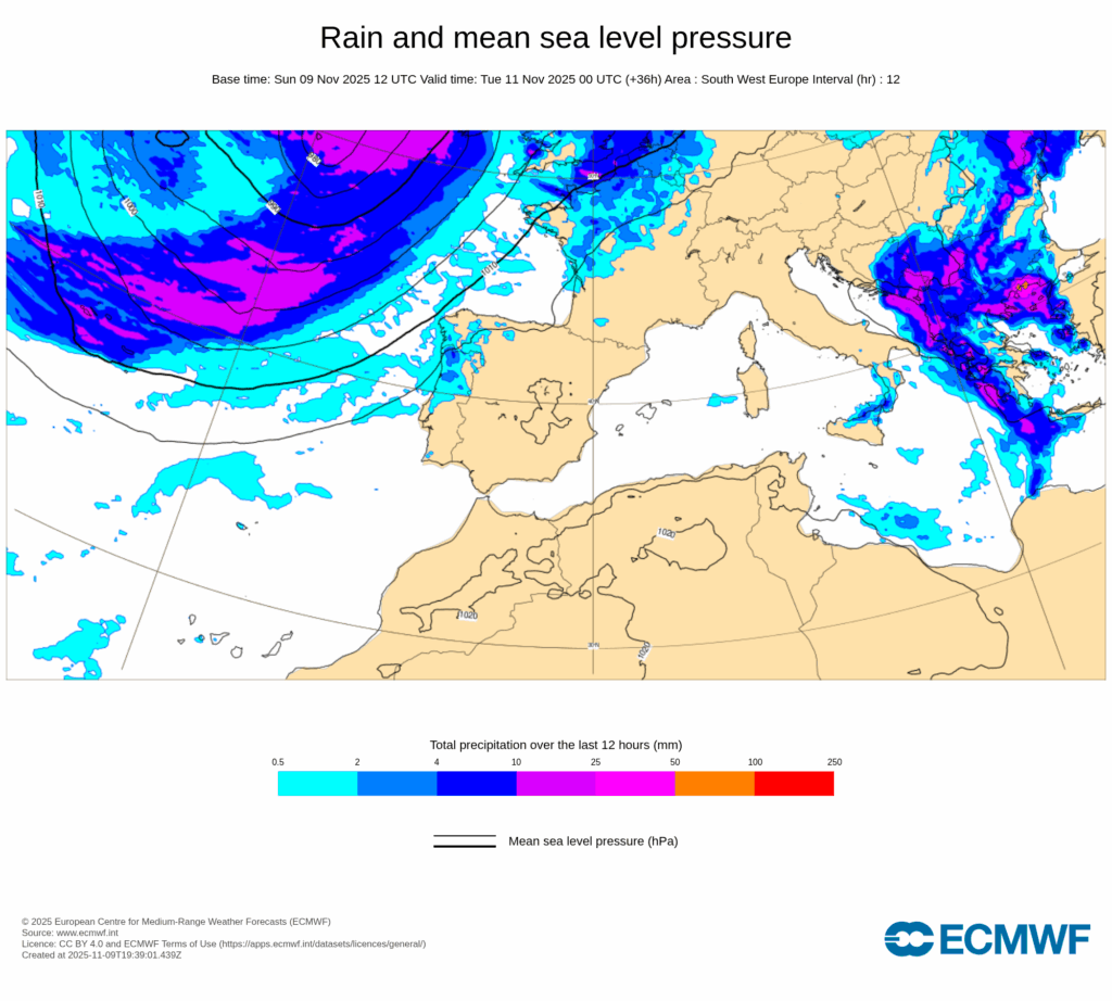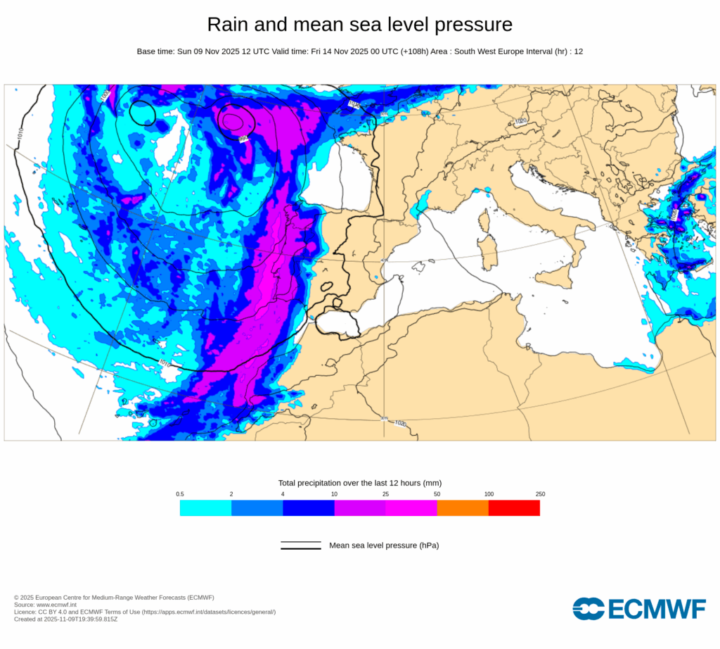Las precipitaciones afectarán al oeste de Asturias y de Castilla y León, entorno del sistema Central, noroeste de Extremadura y especialmente a Galicia, donde en su mitad occidental es probable que sean persistentes y ocasionalmente fuertes con tormentas que podrían dar lugar a acumulaciones significativas en el oeste de A Coruña. Asimismo, podrían acabar afectando a otras zonas del Cantábrico, meseta norte y oeste de la meseta sur en función de la evolución del frente.