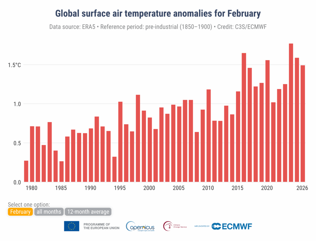 Febrero de 2026 fue el quinto más cálido del registro conocido en el planeta. Los datos climáticos de Copernicus confirman que el último mes del invierno meteorológico volvió a registrar temperaturas elevadas a escala global, mientras Europa mostró un comportamiento térmico más irregular.
