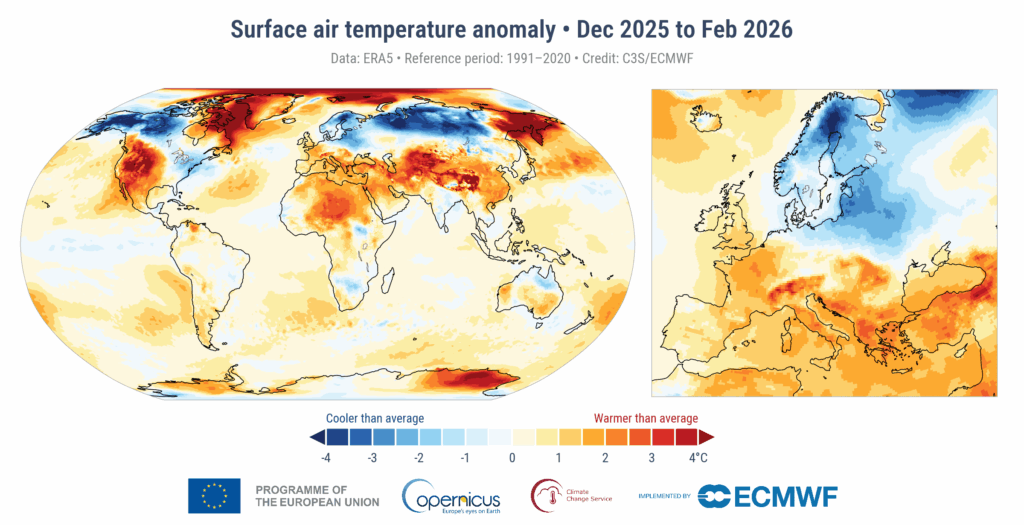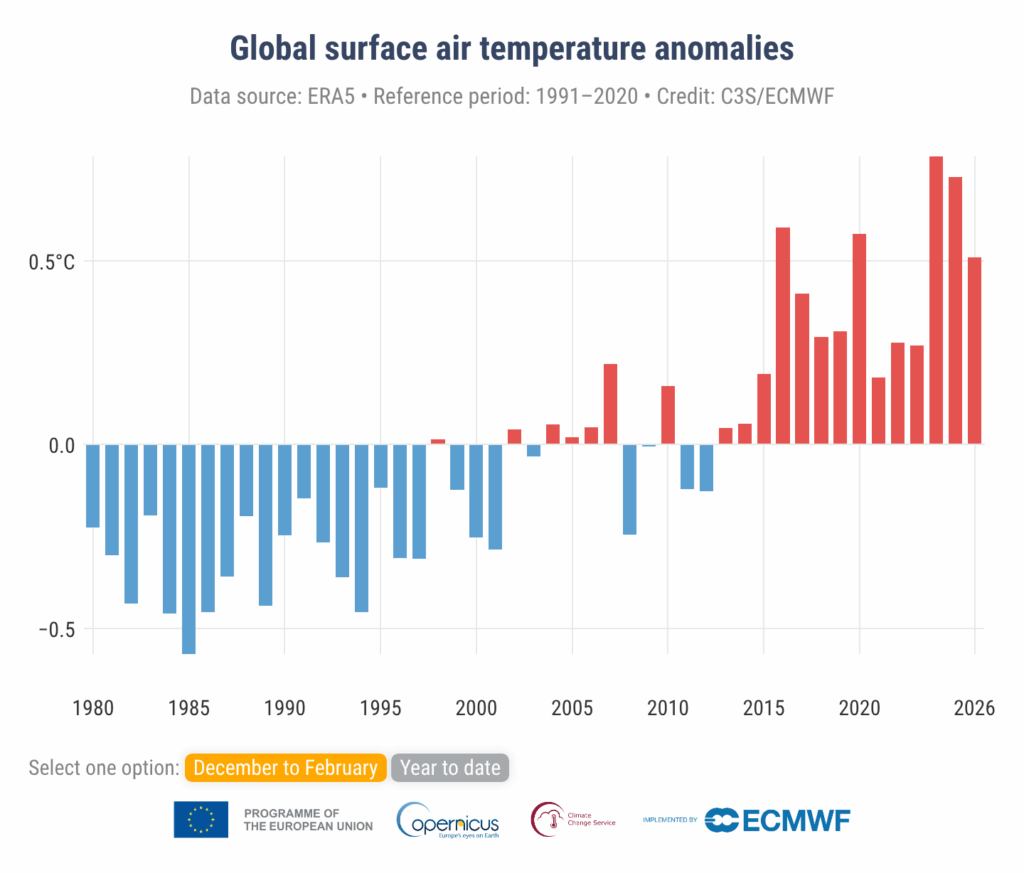 El análisis climático del mes confirma que febrero de 2026 se situó entre los más cálidos registrados en el planeta. La temperatura media global del aire en superficie alcanzó aproximadamente 13,26 °C, lo que supone alrededor de 0,53 °C por encima del promedio del periodo 1991-2020.