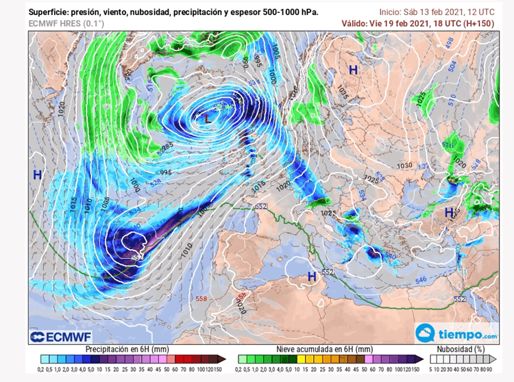 sábado 20, aunque es posible que el tiempo todavía siga estable y soleado en bastantes zonas, el escenario más probable contempla la formación de un sistema de bajas presiones al oeste de Portugal, que
