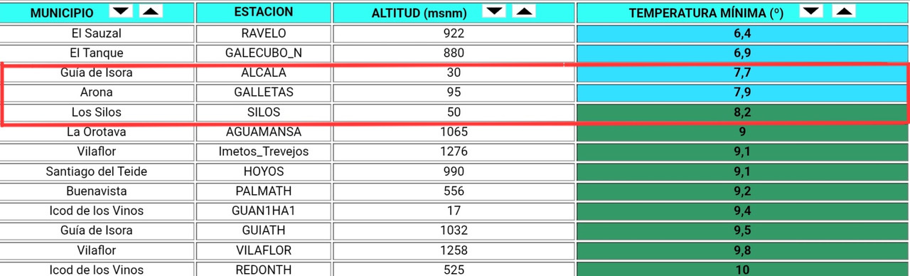 La costa se cuela en temperaturas mínimas, rara vez se ven las dos estaciones más cálidas de la isla la de Alcalá, en Guía de Isora y la de Las Galletas de color azul (<8°C).