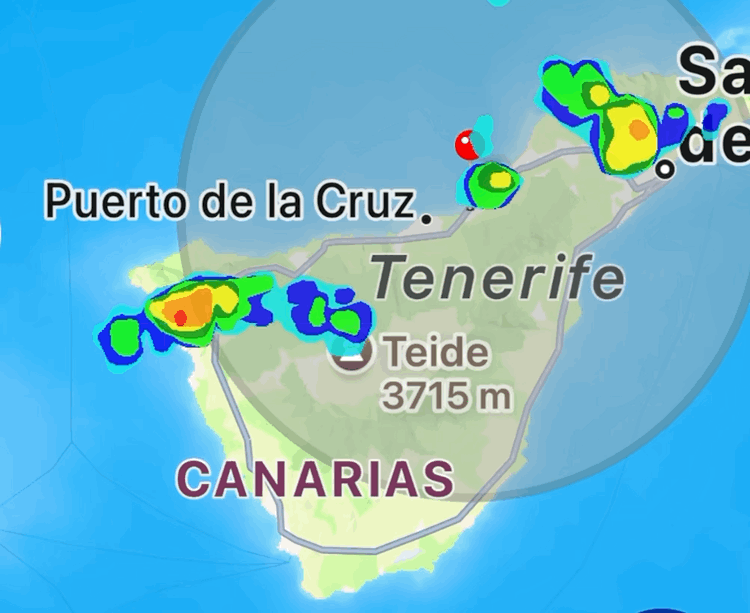 Por La Gomera, en Valle Gran Rey, zona oeste de la isla, me comentan que lleva como media hora sin parar, y ahora que veo en el radar se ve ese punto ahi que se ha generado