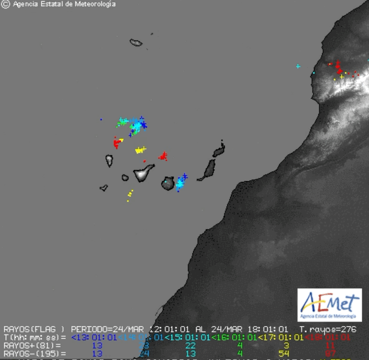 Probables chubascos ocasionales que podrán ser localmente fuertes en las islas montañosas por la mañana, siendo fuertes, persistentes y con tormentas en cumbres y vertientes este y norte de La Palma.Predicción