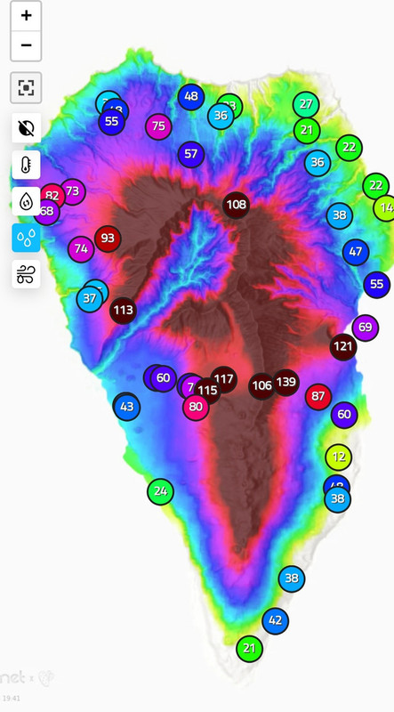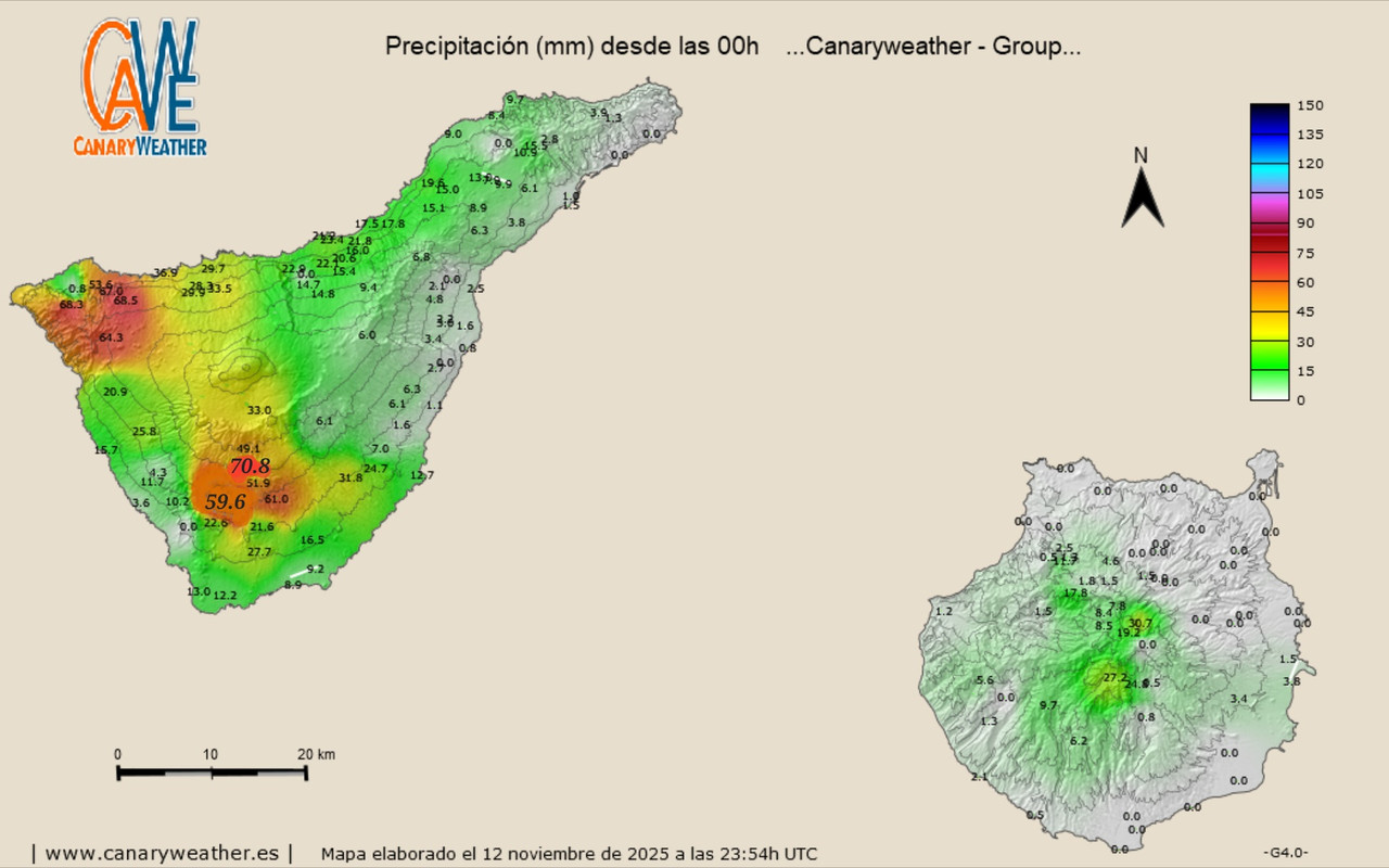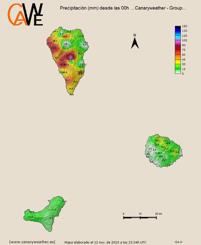 La Palma se lleva el gordo, excelentes acumulados por allí y en menor media en La Gomera, El Hierro, Gran Canaria y Tenerife. La comarca de Teno recibió el frente más fuerte y Vilaflor de exprimidora por lluvias orográficas.