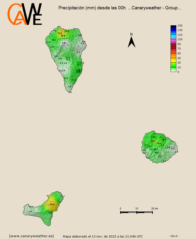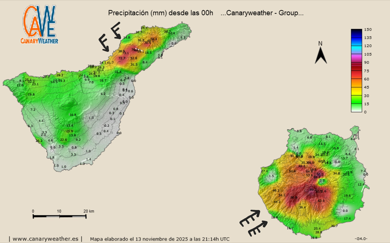 Jueves 13: Gran Canaria la más beneficiada con registros que no se veían desde Hermine y el NE de Tenerife gracias al segundo frente de NW. Llovió sobre mojado en La Palma, El Hierro, La Gomera y llegaron las lluvias moderadas a Fuerteventura y Lanzarote.