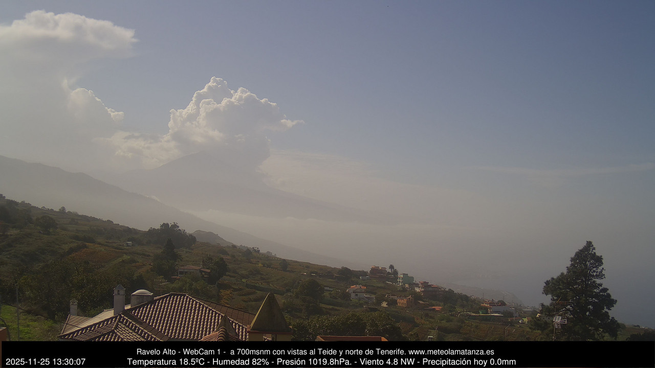 Buena convección sobre las cumbres. Seguramente tenga algo de lluvia y granizo y posiblemente activad eléctrica. Sobre Vilaflor está prácticamente, a ver si Sarita nos dice noticias de allí arriba. La convección contrasta con la jornada calurosa que estamos teniendo.