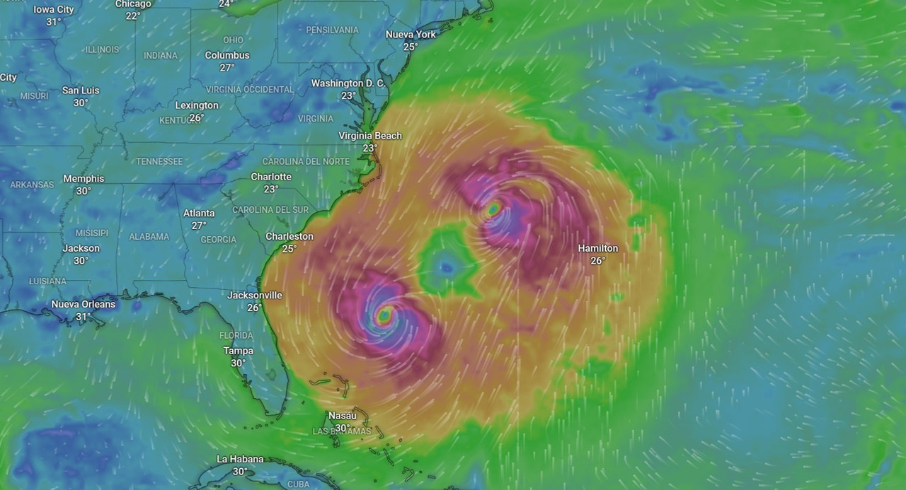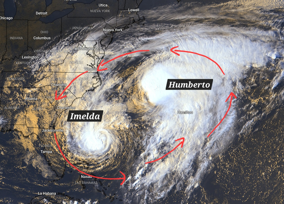 Imelda, que ya es un huracán categoría 1, actualmente ambos son categoría 1. Como ambos tienen la misma intensidad lo que hacen es que empiezan a "orbitarse", es decir, empiezan a girar el uno con el otro por la interacción de sus vientos y núcleos de baja presión.