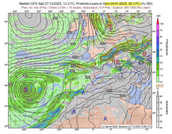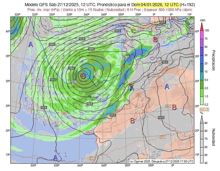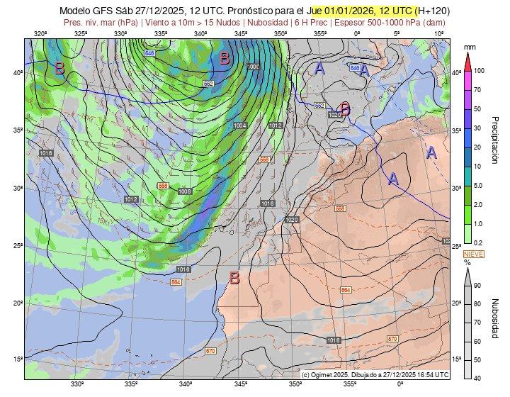 -recordamos el trabajo sucio de una pequeña baja anterior-la de lunes- va a hacer una gran labor de desgaste y minado antes de morir rellenada a nuestro norte,, al entramado anticiclonico no le da tiempo de estar en todos los sitios a la vez-no llega a conectar el Azoriano con la Dorsal Africana, justo lo que veia este modelo pero al reves donde conectaban los dos centros anticiclonicos y nos condenaban en salidas de hasta ayer mismo... de entrante-para estrenar año, un Frente robusto-llovedor de los de marcheta oeste a este del Archipielago componentes oeste-suroeste...