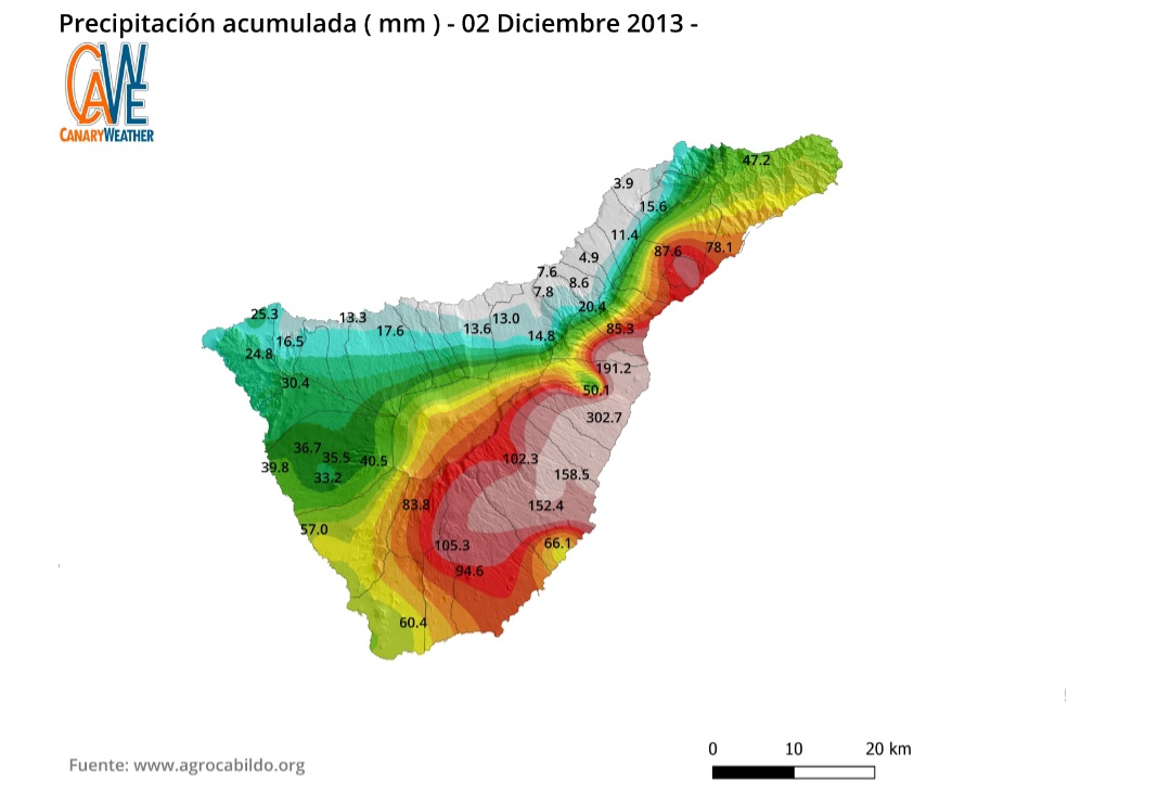 Hace sólo dos años, estábamos viviendo un episodio de lluvias que fueron en momentos puntualmente torrenciales con tormentas fuertes en el sur de Tenerife. Recuerdo que una de las mayores tormentas eléctricas que había visto en Las Galletas y una de los mayores rates que he visto aquí: 110 mm/h. En Vilaflor los acumulados estuvieron en torno a los 50 mm y 40 mm en Las Galletas.