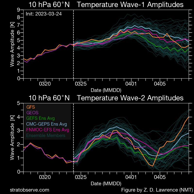 Para saber si ha sido un calentamiento final temprano o tardío , la teoría nos dice que cuando se clasifica como tardío, las ondas planetarias ya suelen estar ausentes en la alta y media estratosfera , en esta gráfica se observa como a partir del 16 de marzo la actividad de las ondas era escasa o nula, con lo cual podemos clasificarlo como tal .