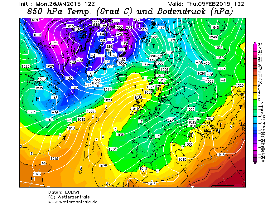 Los extremos de varias ondas frontales podrían tocar el extremo norte peninsular pero poco que reseñar aparte de aumento de nubosidad con probabilidad de precipitaciones débiles.En el Mediterráneo persiste la baja que todavía tiene vida propia debido a la advección fría que recibe y a la que ya hemos hecho mención.En latitudes más altas,una baja con cota de 964 hPa en su núcleo toma el relevo de otra anterior:el gradiente bárico se acentúa desde Groenlandia hasta Europa central recibiendo las islas Británicas una buena descarga de aire ártico en forma de noroestes en superficie: