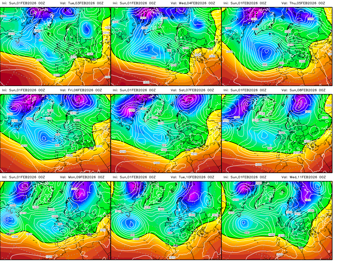 Así empieza febrero. A ver hasta cuándo se alarga la circulación zonal baja. ECMWF y GFS: