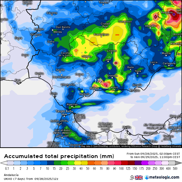 Esta última salida del modelo británico me parece cuanto menos curiosa, acumulados de más de 150mm en la zona de Almogia-Casabermeja y en el oeste granadino para esta noche-madrugada del lunes. Va dispar de los otros modelos, pero quien sabe