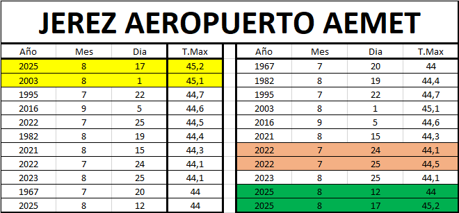Jerez no tiene dato de las 14h, pero ha llegado a 45'4, veremos si se confirma, habrian caido los 45'1 del mitico 1ago03... y ojo a Moron, 45'1 ya, no esta lejos de sus tremendos 46 del mismo 1ago03... :-X
