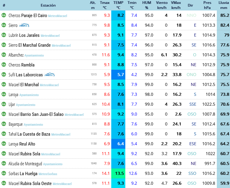 Emilia sigue dejando agua en casi toda Almeria, sobre todo en Filabres y el Almanzora, datos de Ametse...