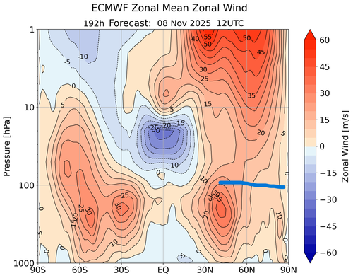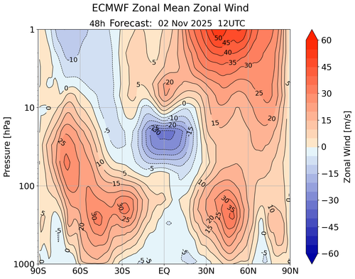 La línea discontinua indica el nivel de altitud/presión utilizado para definir la OCB. Los valores positivos significan que los vientos del oeste en una latitud y altitud dadas fueron más fuertes que el promedio; los valores negativos significan vientos del oeste más débiles que el promedio (o vientos del este más fuertes que el promedio).