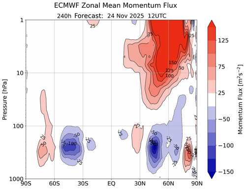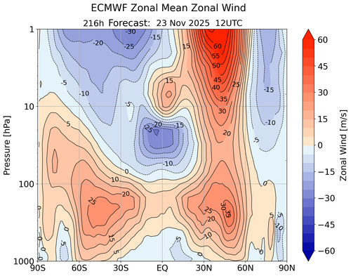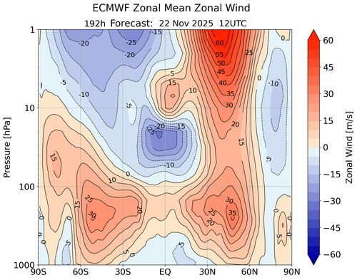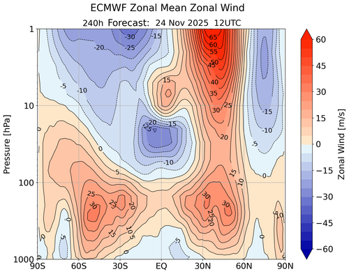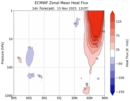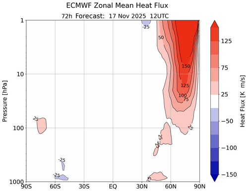 Empezamos con la evolución de la temperatura a 10hPa para el día 16-11-25, sobre la vertical de los 60ºN es de -60º C y sobre 90ºN es de -65 C