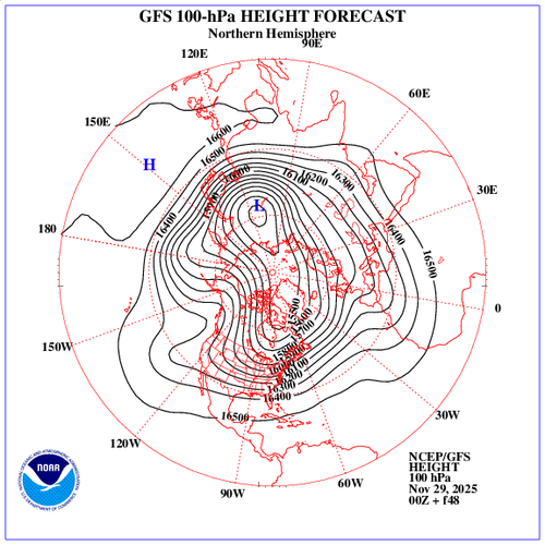 El día 9-12-25 el modelo NCEP/GFS a 10hPa indica un vórtice algo más consolidado casi centrado en el Polo Norte.