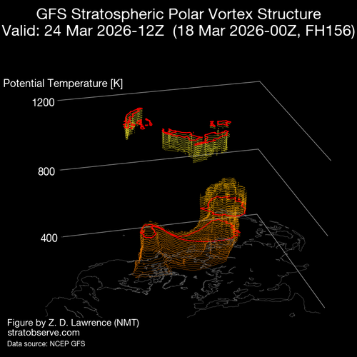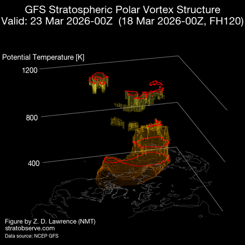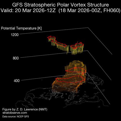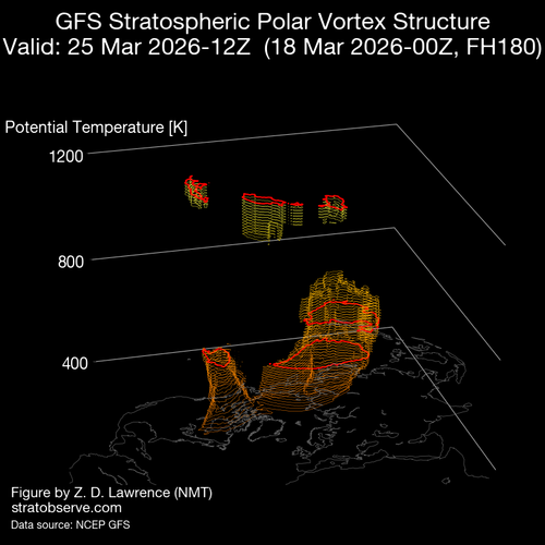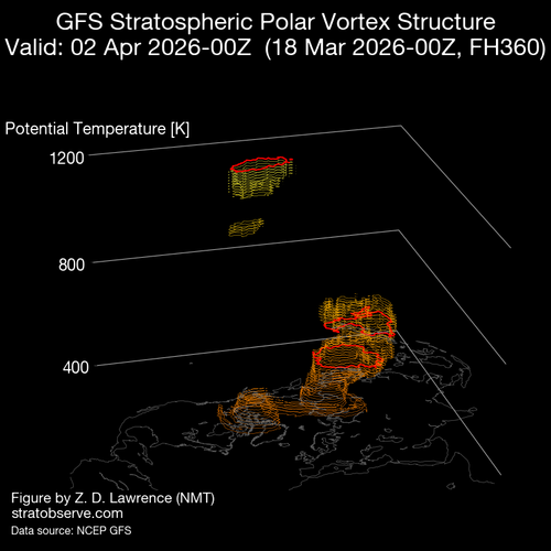 En cuanto a la evolución del vórtice en 3D, estamos asistiendo a la transición del invierno a la primavera que va produciendo la desaparición del vórtice polar, en este periodo de cambio estacional, el calentamiento radiativo de la estratosfera colabora con las ondas planetarias y Rossby desde la troposfera, para decelerar el flujo de vientos del Oeste propios del invierno.