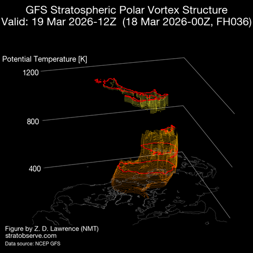 El día 19-3-26 el vórtice se escora hacia Siberia en su parte principal, y se observa una gran capa que se desprende de él, va perdiendo mucha entidad. Porque cuando está el vórtice en esta situación comienza a rotar de modo retrogrado alrededor de su posición media, y comparando la base con la altura del vórtice, las alturas de 1 y 7hPa van súper rápido en comparación con la altura de 50 ó 100hPa que casi no se mueven de su posición, siendo esta tasa de rotación más fuerte en la estratosfera superior, por ello van desprendiendo capas del vórtice.