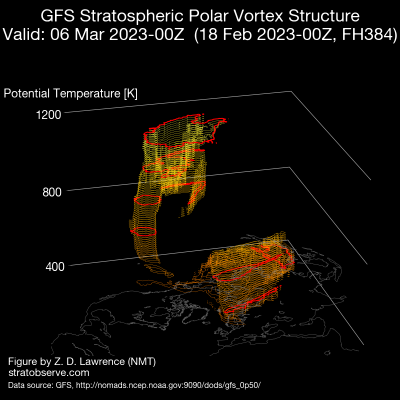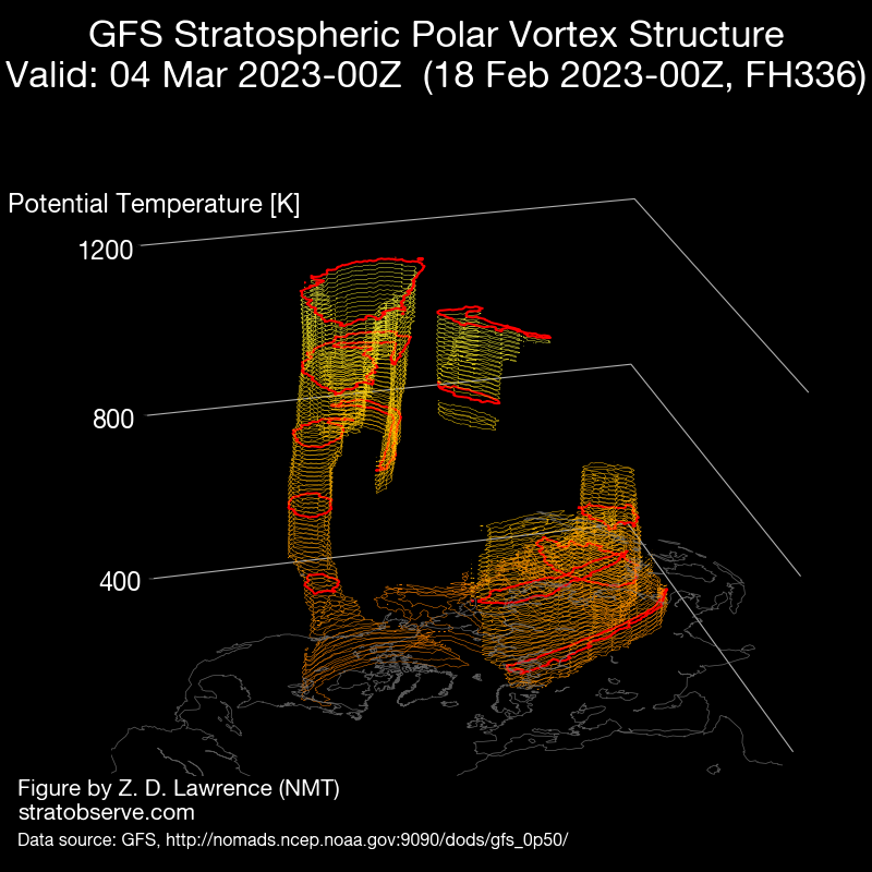 El día 2-3-23 , la parte superior del vórtice se desconecta de la parte media e inferior , marcando el final del ciclo del calentamiento estratosférico