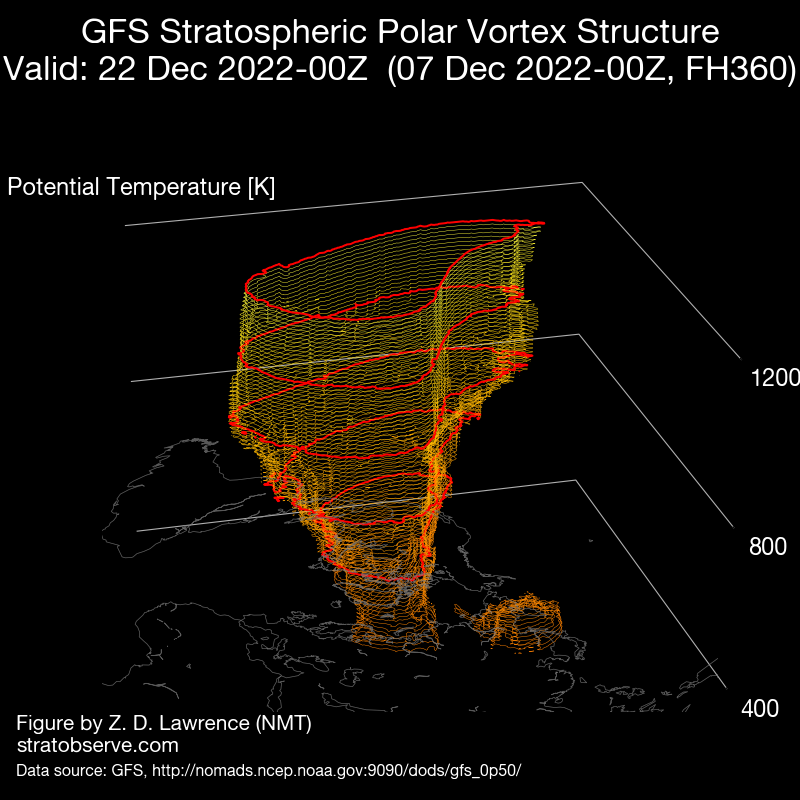A medida que se acerca el inicio del calentamiento , aumentara la inclinación de la parte superior del vórtice hacia el oeste , moviéndose todo el vórtice hacia el ecuador o latitudes mas bajas . Y el vórtice abarcara casi la mitad del hemisferio norte en su longitud como se observa en los mapas de MeteoCiel y el Wetterzentrale .