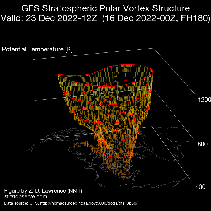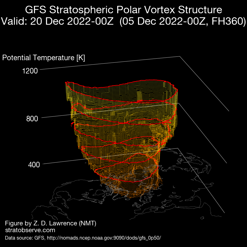 A medida que se acerca el inicio del calentamiento , aumentara la inclinación de la parte superior del vórtice hacia el oeste , moviéndose todo el vórtice hacia el ecuador o latitudes mas bajas . Y el vórtice abarcara casi la mitad del hemisferio norte en su longitud como se observa en los mapas de MeteoCiel y el Wetterzentrale .