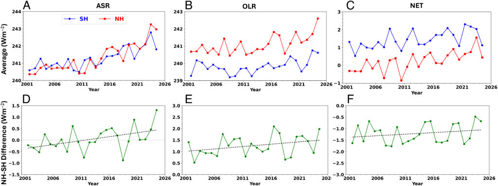 Esta diferencia hemisférica, aunque pequeña en magnitud (alrededor de 0,34 W/m² por década), es estadísticamente significativa.
