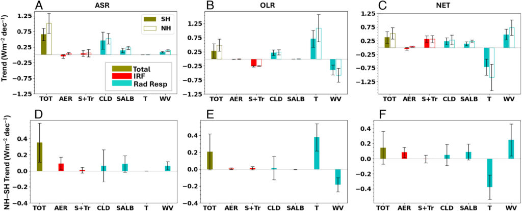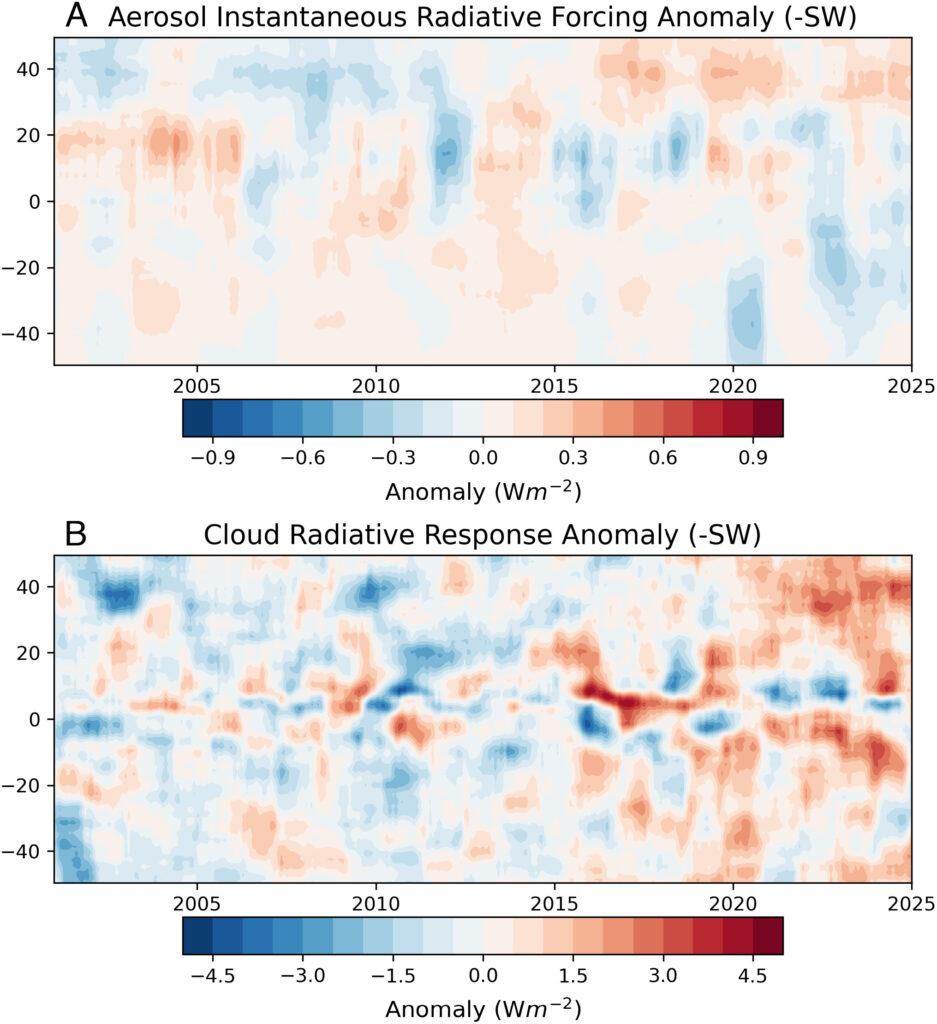 Otra parte del desequilibrio se explica por modificaciones en la humedad, el vapor de agua, la nubosidad y su interacción con la energía solar. Los cambios en la respuesta radiativa de las nubes y las interacciones entre aerosoles y radiación también juegan un rol importante en esta asimetría hemisférica.