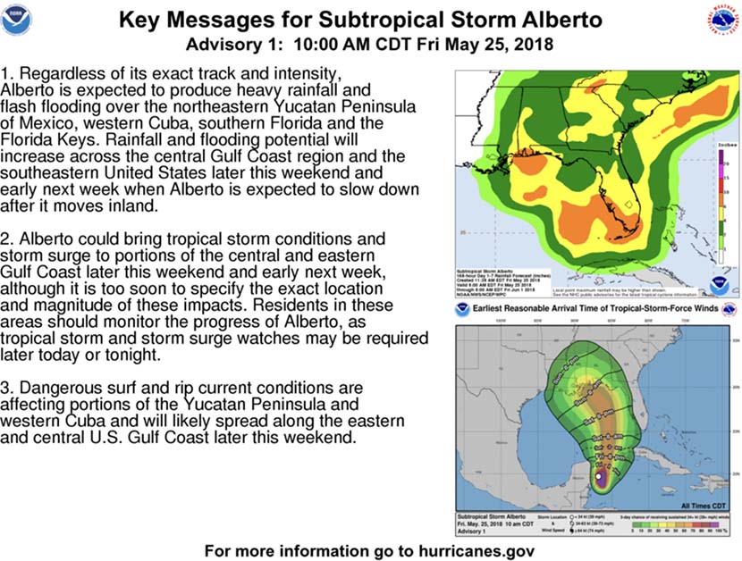Notas clave para la tormenta subtropical ALBERTO 01L en el Golfo de México. La lluvia, el principal y temido FMA asociado. Crédito: Centro Nacional de Huracanes de Florida, USA.