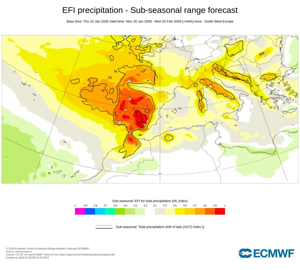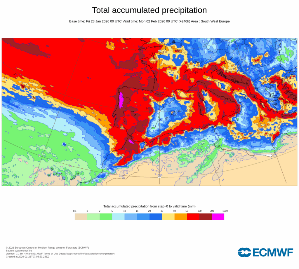 El temporal que se avecina será importante y largo: las anomalías de precipitación a una semana vista son muy positivas en la Península Ibérica, mientras que la procedencia de las masas de aire que nos van a invadir es de latitudes muy septentrionales por lo que, además, el frío está también garantizado.