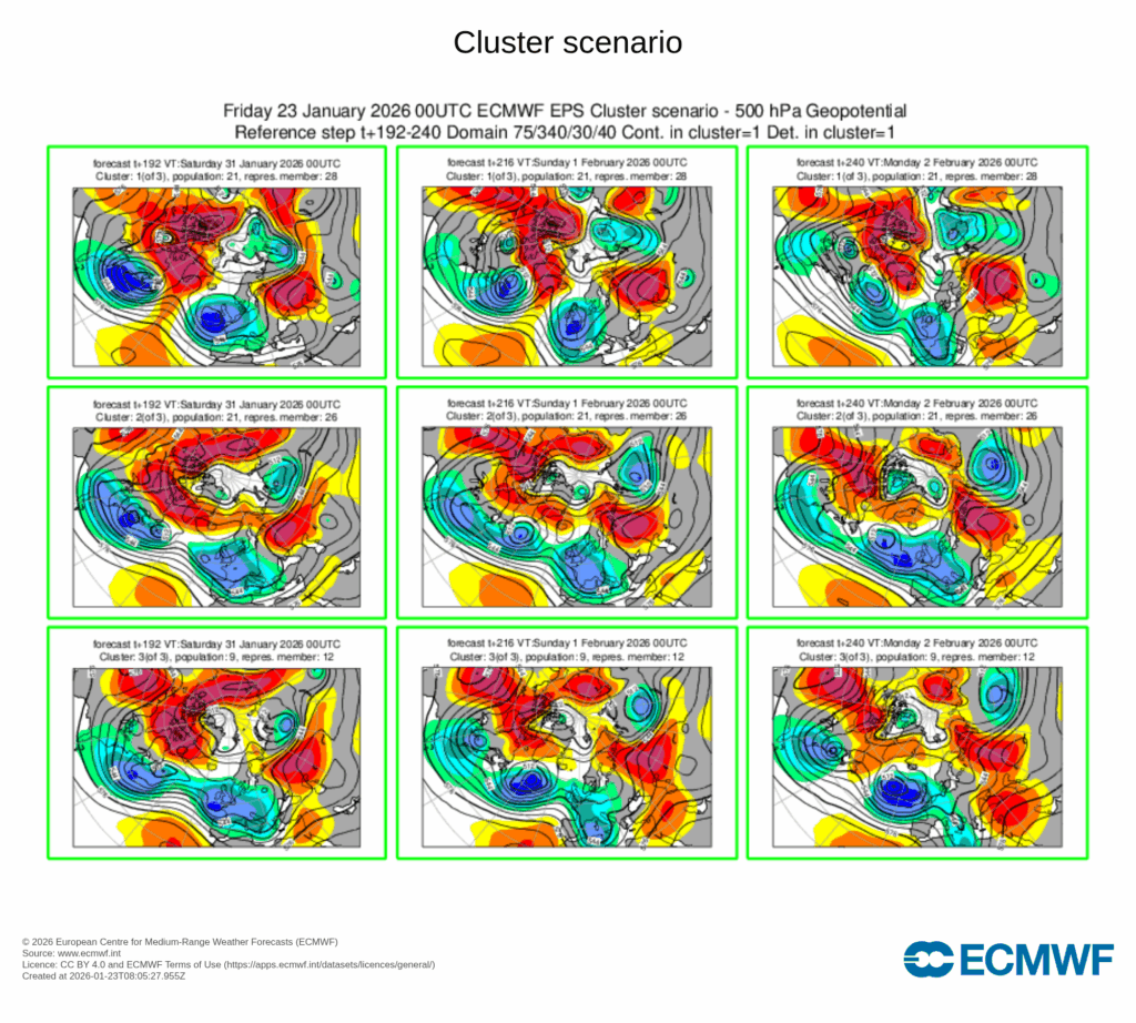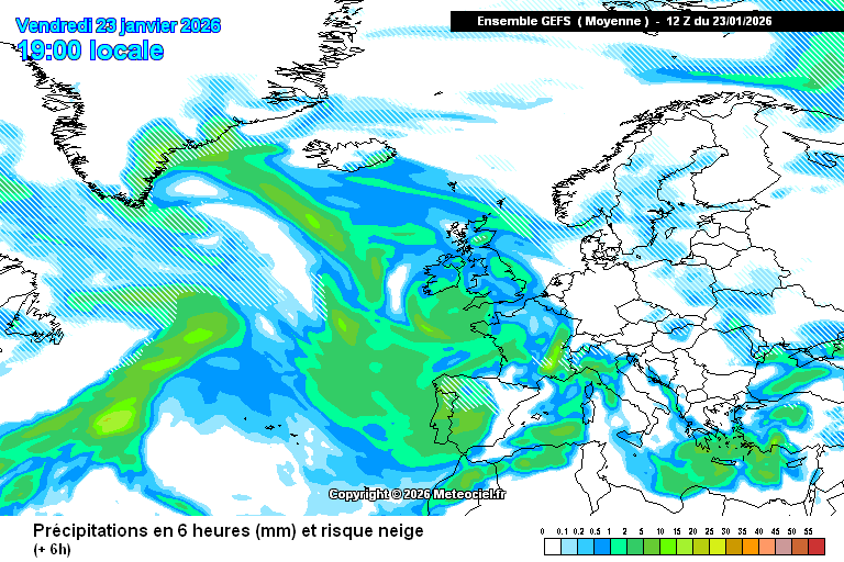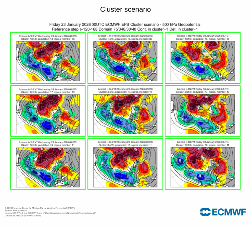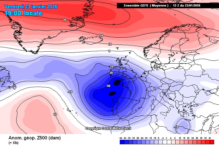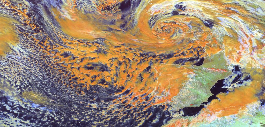 La borrasca ocupa buena parte del Atlántico nororiental, arrastrando ya diferentes bandas nubosas y otras que se generarán en las próximas fechas, incluidas nuevas perturbaciones. Tiempo puramente invernal.