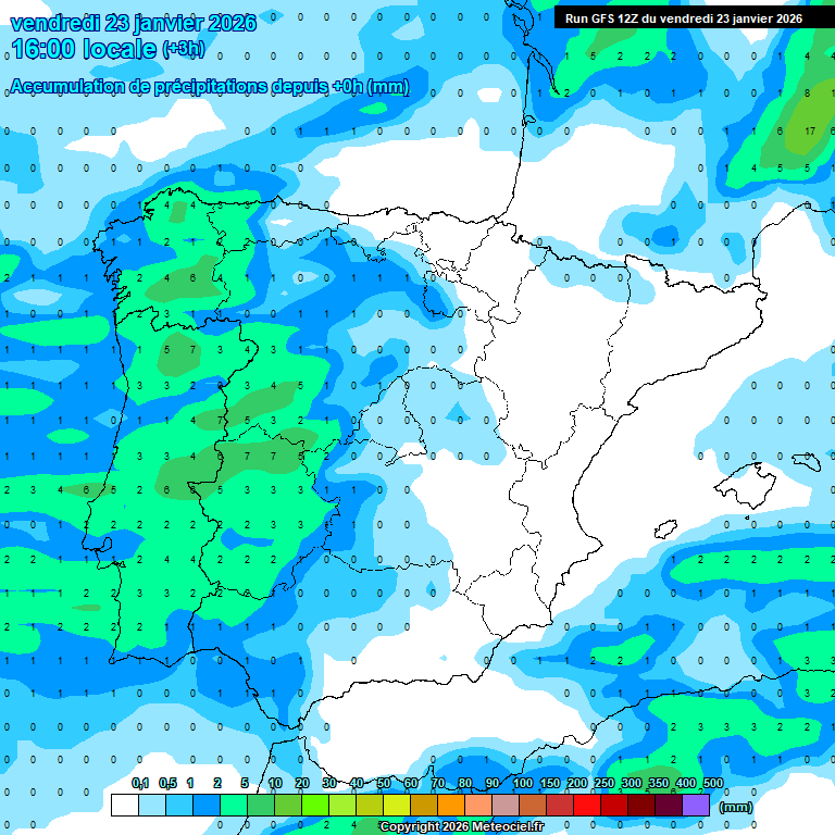 La cota de nieve se situará muy baja durante la primera mitad del día: 300-500 m en buena parte de la mitad norte y 600-800 m en el resto, con tendencia a ir subiendo por el oeste peninsular y quedando al final del día por encima de los 1000m en el tercio oeste peninsular.