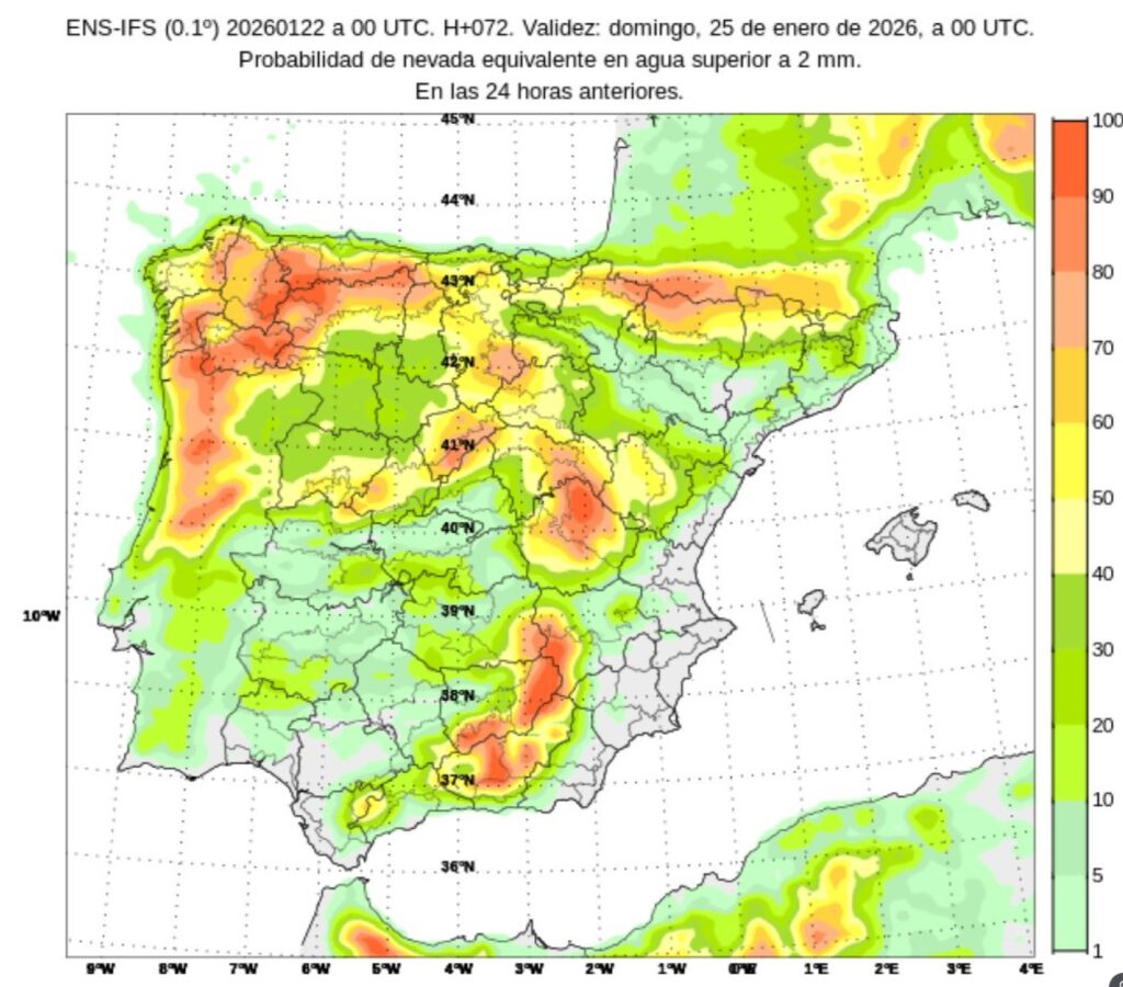 Debido al carácter de la precipitación, en forma de chubascos, existe incertidumbre en la extensión espacial de las nevadas, especialmente en zonas más bajas del cuadrante noroccidental peninsular, así como en las cotas, que puntualmente podrían descender más en zonas donde la nevada sea más intensa.