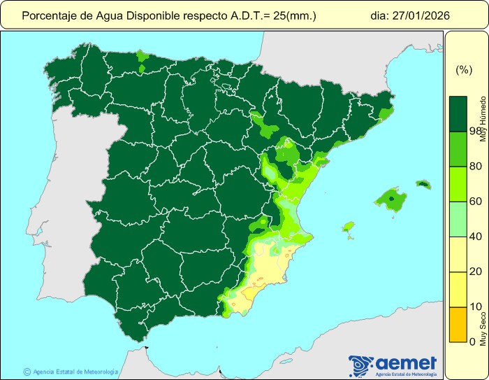 Las claves de la configuración atmosférica ya han quedado definidas, pero es importante destacar que, a la profundidad de las nuevas borrascas, se va a sumar un suelo muy saturado como se puede ver en estos mapas facilitados por AEMET.