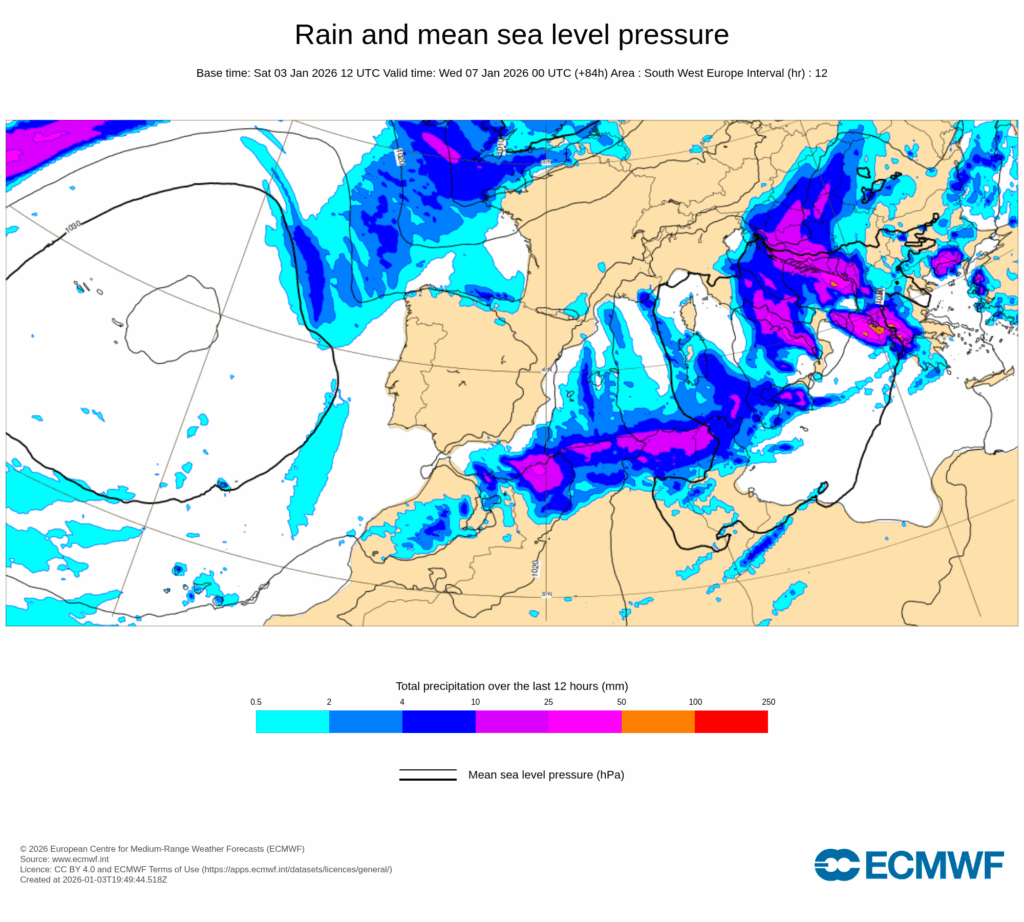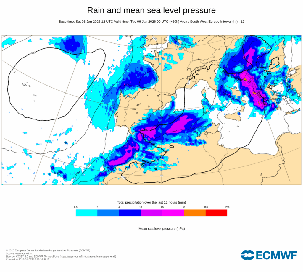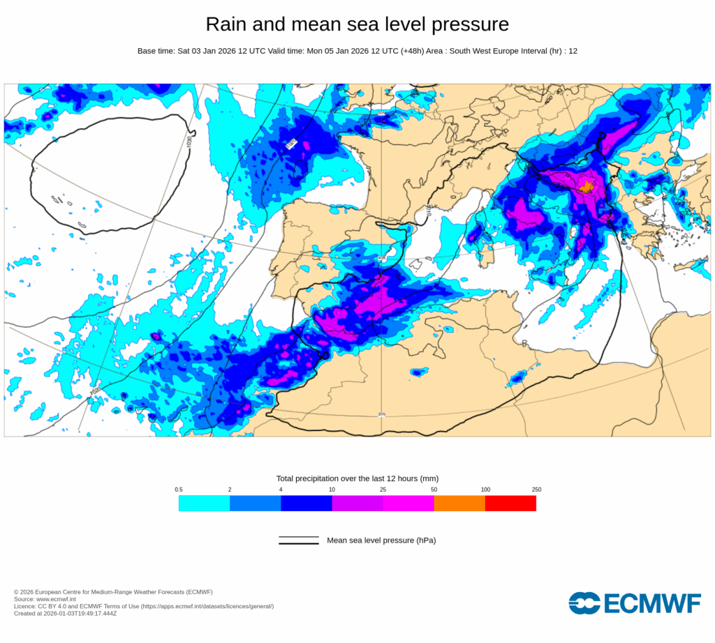 El pronóstico nos asegura lluvias fuertes el domingo y nevadas en cotas bajas el lunes, fruto del paso de una pequeña baja desde el Golfo de Cádiz hacia el Mediterráneo por Alborán y de la advección de una masa de aire de origen ártico sobre la Península Ibérica.