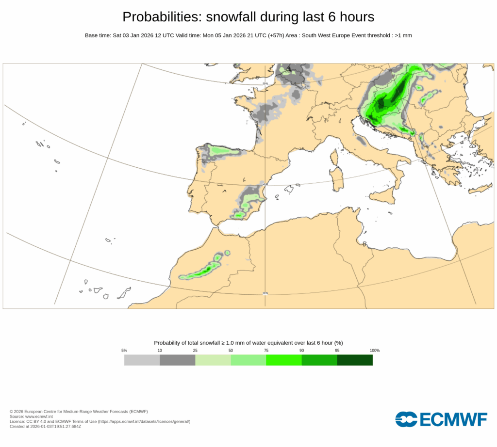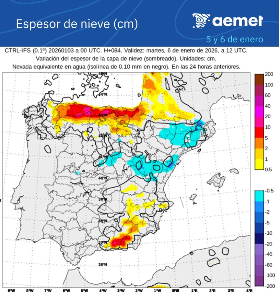 Aunque todavía existe incertidumbre sobre la cobertura espacial e intensidad de las nevadas, se espera que el lunes 5 de enero se alcance el punto álgido de este episodio.
