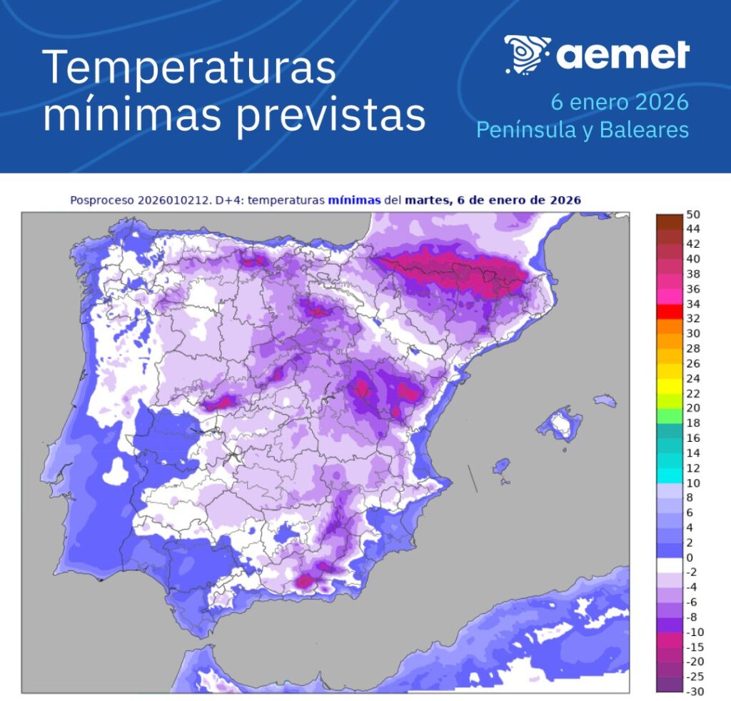 De esta forma se espera que las heladas se generalicen en gran parte del interior peninsular durante el lunes 5 y el martes 6, siendo moderadas en amplias zonas de las mesetas y localmente fuertes en torno a los principales sistemas montañosos, especialmente del área pirenaica.