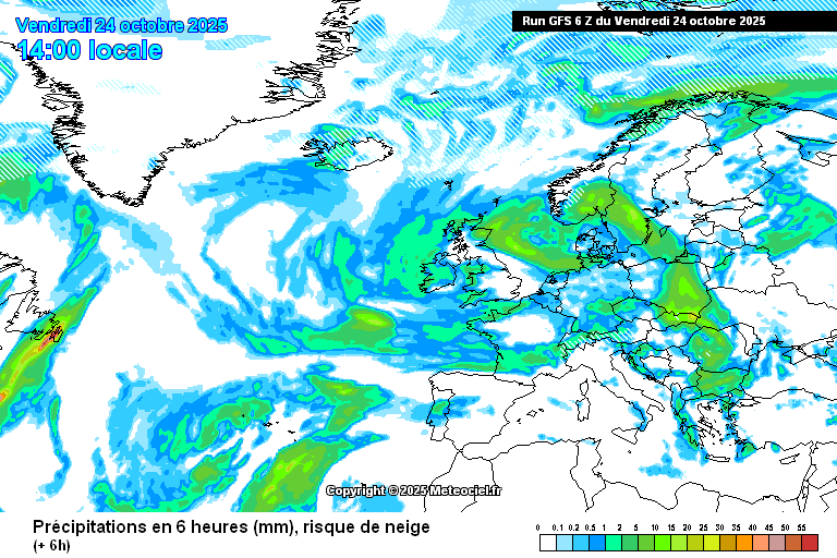 En el norte, la entrada de una masa fría y húmeda postfrontal dejará cielos muy nubosos con precipitaciones más persistentes en el Cantábrico oriental y Pirineos donde es probable que sean de nieve por encima de 1400/1800m.
