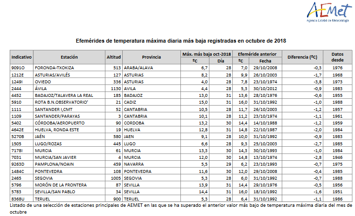 En 20 estaciones principales la temperatura máxima diaria más baja del mes fue la más baja desde el comienzo de la serie, mientras que en una estación principal, Bilbao/aeropuerto, la temperatura mínima del día 13 fue la más alta de la serie de octubre con 22,4 ºC.
